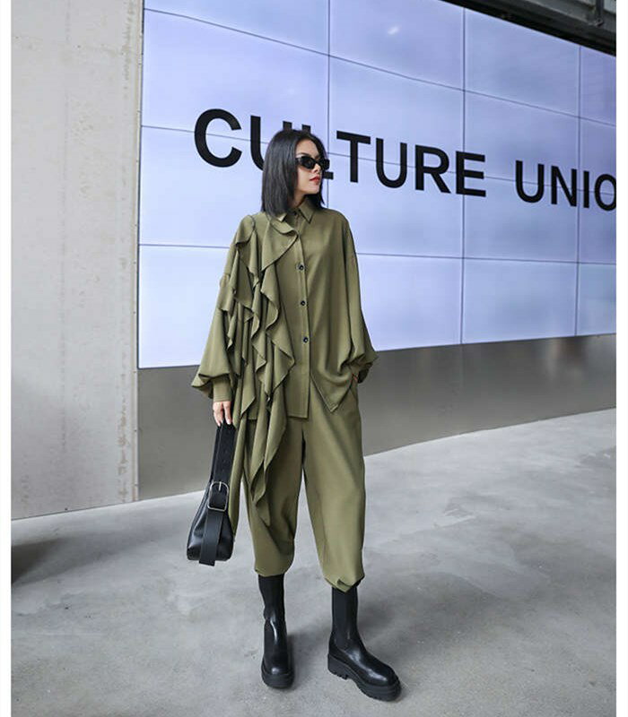 セットアップ レディース 秋 レディース きれいめ セットアップ 秋 冬 フリーサイズ グリーン ブラック 個性デザイン ブラウス ワイドパンツ 2点セット ゆったり 上品 おしゃれ 大きサイズ ストリート アシメントリー 送料無料