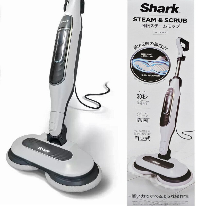 シャーク 回転スチームモップ S7001J Shark Steam & Scrub Mop S7001J 44595 カラーホワイト サイズ1055 x 352 x 163 mm(高さ x 幅 x 奥行) 重量本体 3.3kg 商品の特徴 スチームと回転パッドで最大2倍の掃除力 スチームパワーで99.9%除菌 軽い力ですべるような操作性 床や汚れに合わせて選べる3つのモード ちょい置きや収納に便利な自立式 汚れをしっかり吸着、洗濯機で洗えるパッド たった30秒でスチーム準備完了 メーカー1年保証 商品の詳細 『高温スチーム』と『回転パッド』で頑固な汚れを落として、しっかり除菌。