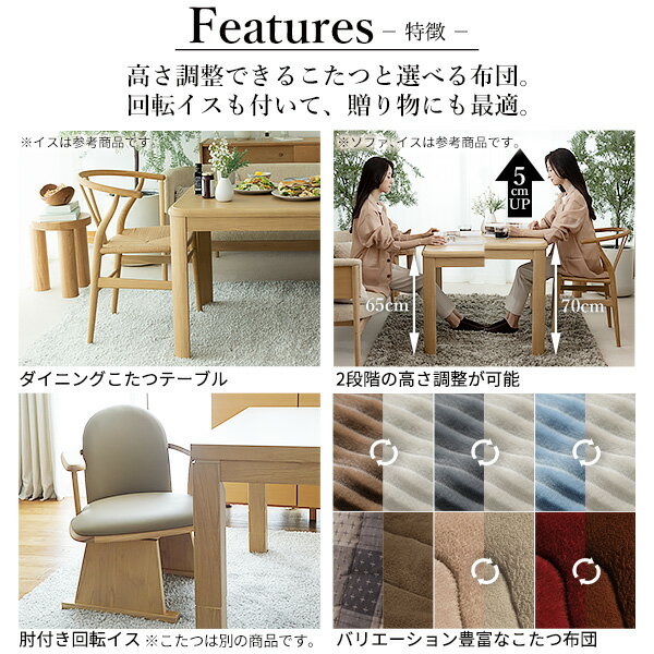 【セット構成】こたつx1台 布団x1枚 肘付回転椅子x4脚 【仕様】 ■こたつ 天板:繊維板(転写プリント) 脚部:天然木(ラバーウッド) 薄型石英管ヒーター(500W・中間スイッチ式) ◎一部組立品(脚部取付) ■こたつ布団 [しじら]表地:綿100% 裏地:アクリル100% 中綿:ポリエステル100% [レンガ・ベージュ]表地・裏地:ポリエステル100%(はっ水フランネル) 中綿:ポリエステル100% ■肘付回転椅子 フレーム:天然木 (アカシア) 座面:合成皮革 ◎一部組立品(脚部取付) 【サイズ】 ■こたつ 幅150x奥行90x高さ70/65cm・約23kg 天板:厚み30mm ■布団 [しじら織り]310x250cm・中綿約1.55kg [レンガ・ベージュ]312x252cm・中綿約780g ■肘付き回転椅子 幅55x奥行53x高さ74(69)cm・約10kg 株式会社ナカムラ(I-2700157)こたつ単品 >90x60 >80x80 >105x80 >135x80 >150x90 こたつ+選べるこたつ布団セット >90x60 >80x80 >105x80 >135x80 >150x90 こたつ+選べるこたつ布団+回転椅子セット >90x60 >80x80 >105x80 >135x80 >150x90 こたつ+選べるこたつ布団+肘付き回転椅子セット >90x60 >80x80 >105x80 >135x80 >150x90 こたつ掛け布団単品(しじら織り) >90x60 >80x80 >105x80 >135x80 >150x90 こたつ掛け布団単品(はっ水リバーシブル) >90x60 >80x80 >105x80 >135x80 >150x90 肘のない回転椅子 >単品 肘付き回転椅子 >単品 >組立設置サービスのご購入 >引取り(解体)サービスのご購入