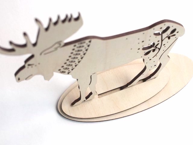 素材: 白樺の合板 サイズ: ヘラジカ…14cm x 13cm 台座…13.5cm x 5.2cm