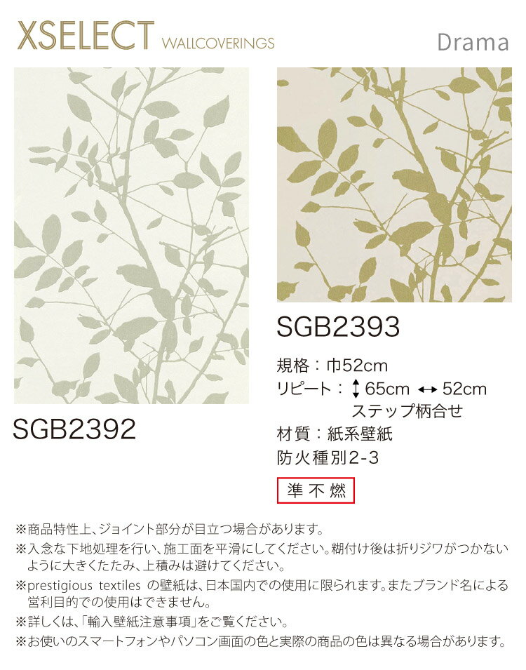 サンゲツ XSELECT 輸入壁紙 イギリス Pt 植物 木 (52cm巾) SGB2392他 全2種類 Drama 壁紙 [10m以上1m単位] 商品の詳しい情報ブランド名prestigious textiles品種壁紙商品名sangetsuXSELECT 輸入壁紙Drama掲載品番SGB2392 SGB2393生産国イギリス規格巾 52cmリピート縦方向:65cm横方向:52cmステップ柄合わせ材質紙防火性能準不燃ホルムアルデヒド放散等級F☆