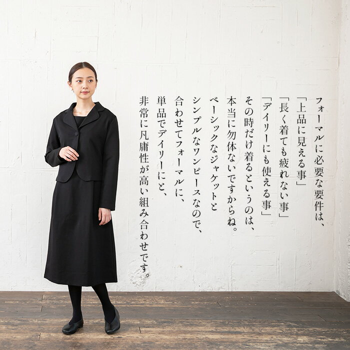 礼服 レディース フォーマル ミセス スーツ ストレッチ セットアップ 2点セット 日本製 40代 50代 60代 ワンピース テーラードジャケット 綿 コットン 入学式 卒業式 母 ブラックフォーマル きれいめ アンサンブル セレモニースーツ 着痩せ 黒 ブラック シンプル 発表会 学校行事 通年 オールシーズン 結婚式 顔合わせ 七五三 冠婚葬祭TOKYO BASIC コットン混 ハイテンションストレッチ セットアップ SIZEM・L COLORブラック カラー ブラック サイズ 【ジャケット】 サイズ 身丈 バスト 肩幅 袖丈 アームホール 袖口幅 ウエスト幅 M 約50cm 約100cm 約39cm 約56.5cm 約21.5cm 約12cm 約44cm L 約52cm 約106cm 約41cm 約57.5cm 約22.5cm 約12.5cm 約47cm 【ワンピース】 サイズ 身丈 バスト 肩幅 袖丈 アームホール 袖口幅 裾幅 ウエスト幅 M 約110cm 約96cm 約38cm 約28cm 約21.5cm 約13.5cm 約63cm 約43cm L 約112cm 約102cm 約40cm 約29cm 約22.5cm 約14cm 約65.5cm 約46cm サイズ計測方法はコチラ>>> 原産国 日本製 素材 コットン64%、ナイロン32%、ポリウレタン4% 洗濯表記 手洗い 裏地 なし ポケット なし モデル着用サイズ Mサイズ メール便 × 特徴 オン・オフ着まわせる。